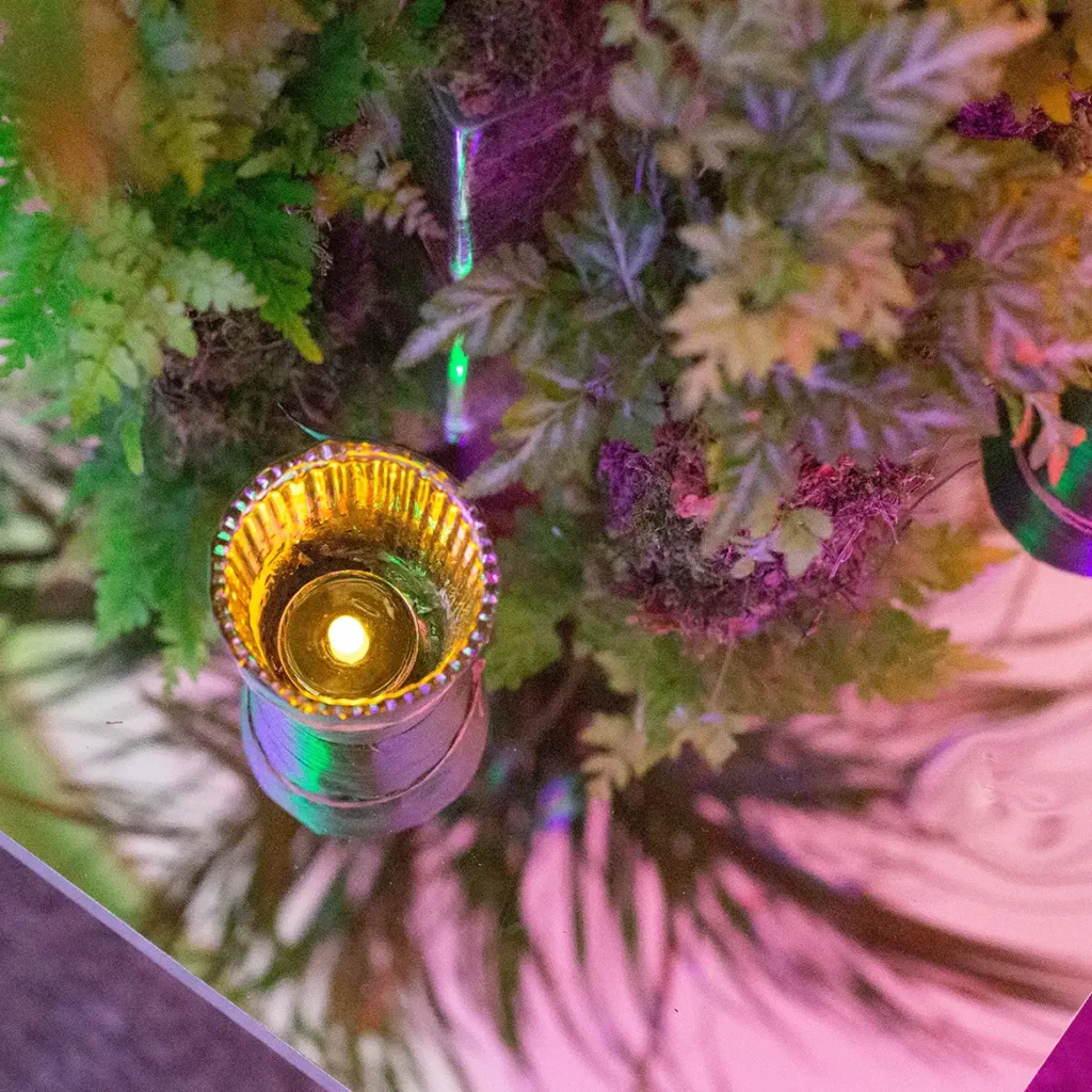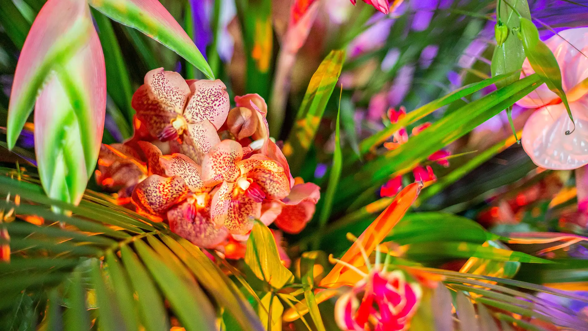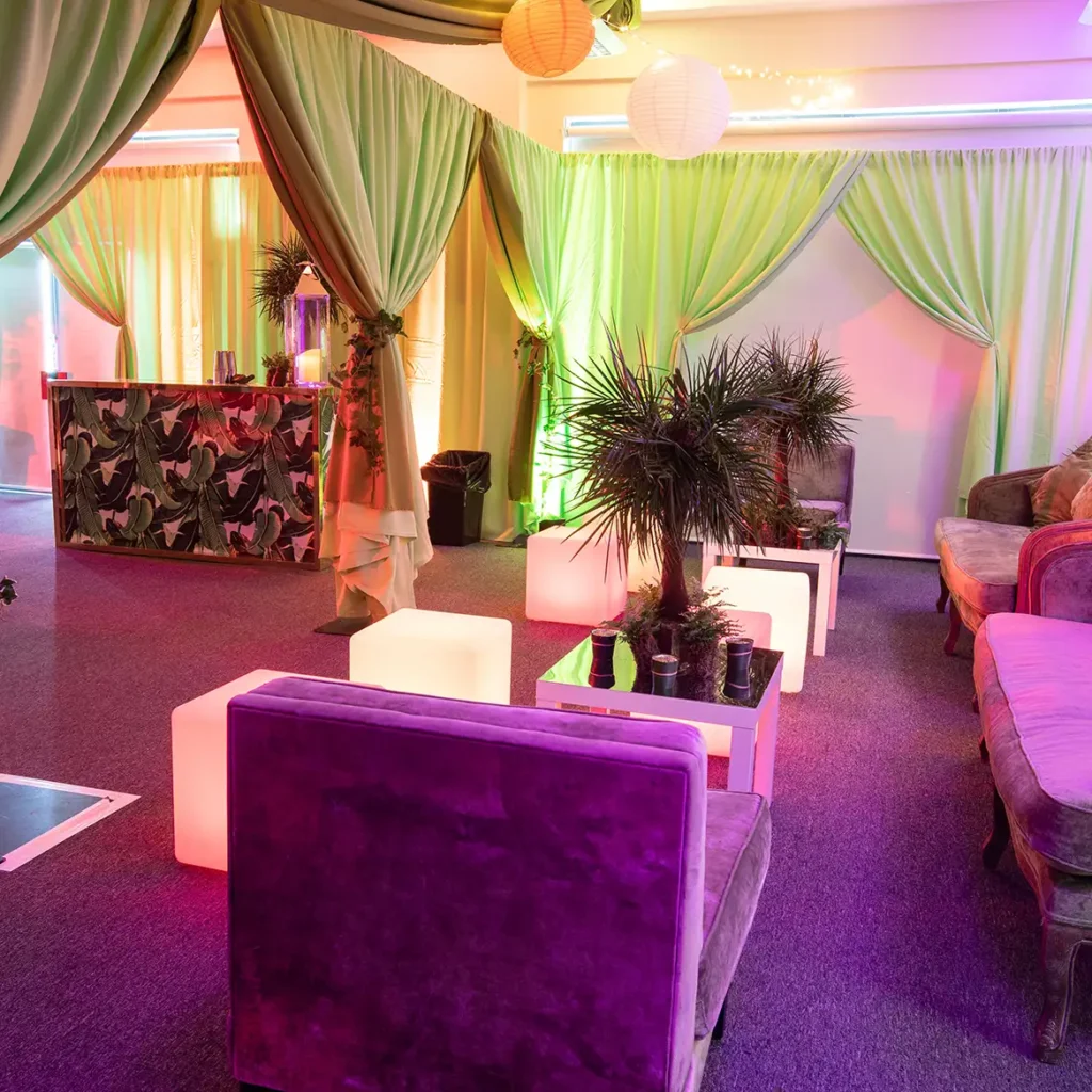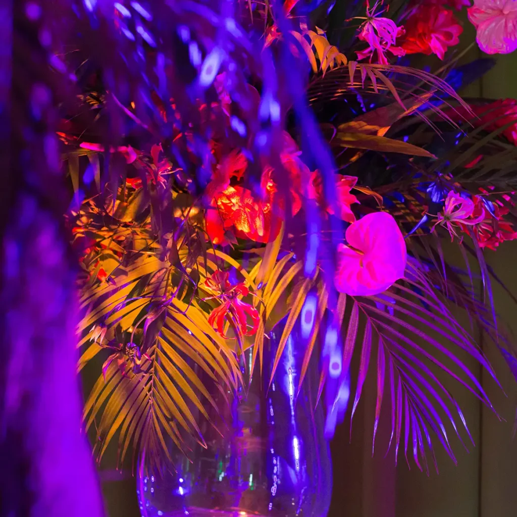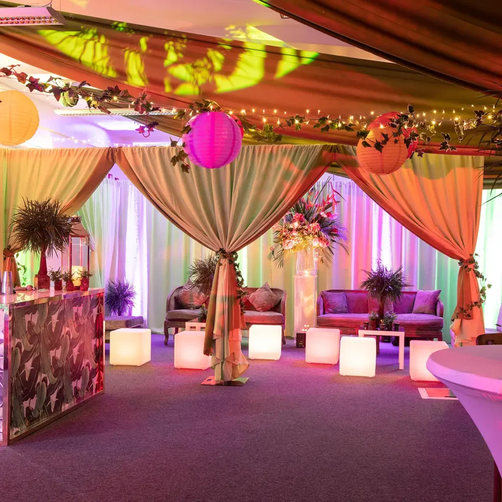 The trick was to go big, bold and fearless. It meant vibrant colours, swathes of fabric and drapery, an exhilarating lighting scheme and a plethora of extravagant tropical floral arrangements and plenty of potted palm trees. Within the space we created zoned areas through the simple use of drapery. The main dance area featured a stage and bar, and there was also a chill-out area with stylish sofas where guests could relax and chat.