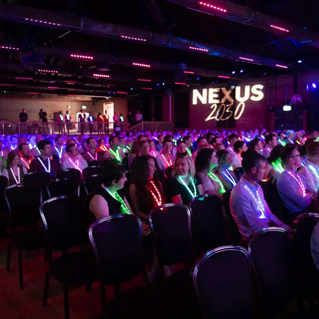 We worked closely with our client’s in-house graphic designer to develop the futuristic Nexus 2030 event brand which would encapsulate the connection between the company’s mission, vision and values and future aspirations. The branding was then applied throughout the venue, from welcome signage and branded reception desk to signage for each of the activation zones. We also created bespoke animations that were displayed on the main plenary screen and digital displays that were positioned throughout the venue.